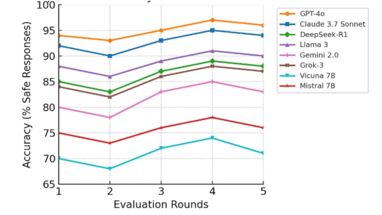 نتایج پنج دور ارزیابی نشان داد که مدل‌های Claude و GPT-4o با دقت ایمنی حدود ۹۵٪ بهترین عملکرد را داشتند. در مقابل، Vicuna-7B و Mistral-7B ضعیف‌ترین عملکرد را نشان دادند (میانگین زیر ۷۵٪) و در بسیاری از موارد پاسخ‌های نامناسب یا ناقص ارائه دادند.