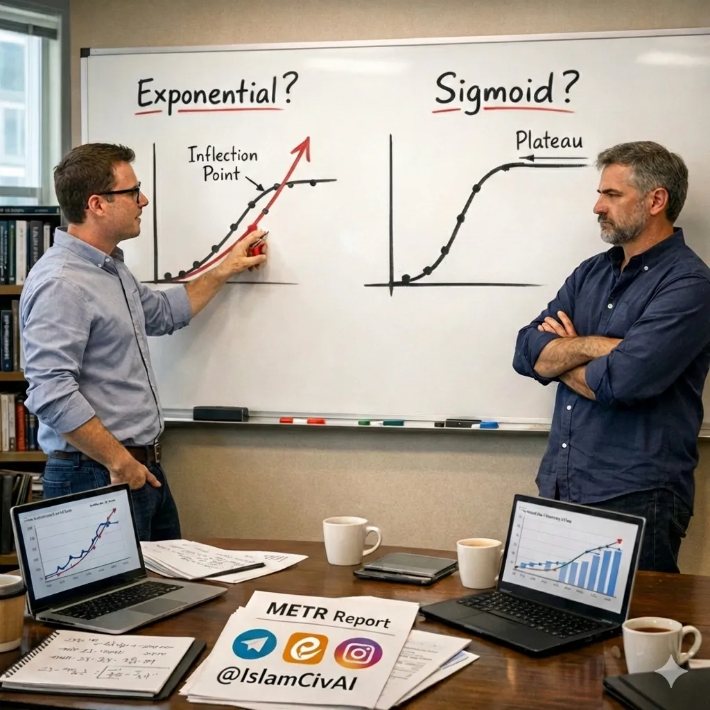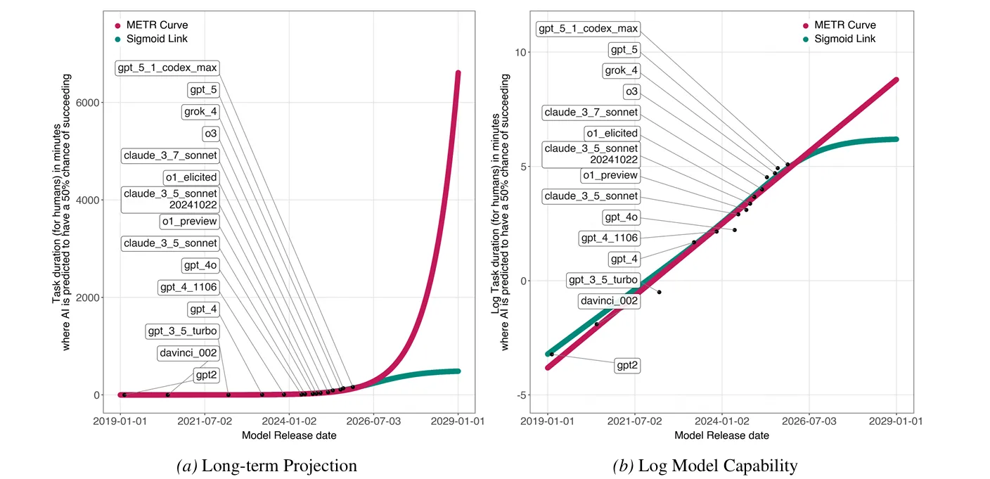 گزارش METR (Model Evaluation & Threat Research) نشان داد که قابلیتهای هوش مصنوعی از سال ۲۰۱۹ بهصورت نمایی رو به افزایش بوده است؛ بهعنوان مثال این گزارش ادعا میکند افق ۵۰٪ مدلها هر هفت ماه دو برابر میشود. در این مقاله اما نشان داده میشود که دادهها از رشد نمایی حمایت نمیکنند، حتی در دورههای کوتاهمدت. با بهکارگیری منحنیهای سیگموئید بر دادههای METR، مشخص شد نقطهی عطف رشد (سرعت کمتر شدن پیشرفت) در واقع در گذشته (حدود ژوئن ۲۰۲۵) رخ داده و نه آینده؛ یعنی ممکن است رشد AI بزودی به اشباع برسد. علاوه بر این، مدلی پیچیدهتر پیشنهاد شده که قابلیتهای هوش مصنوعی را به دو فناوری «مدل پایه» و «توانایی استدلال» تقسیم میکند، و ثابت میکند در این مدل نیز نقطهی عطف پیشرفت زودرس ظاهر خواهد شد. هدف اصلی، ارائه یک دیدگاه جایگزین و برجسته کردن شکنندگی پیشبینیهای فعلی رشد نمایی است؛ این مدل لزوماً پیشبینی دقیق نمیکند، اما امکان وجود روند اشباع را برجسته میسازد.