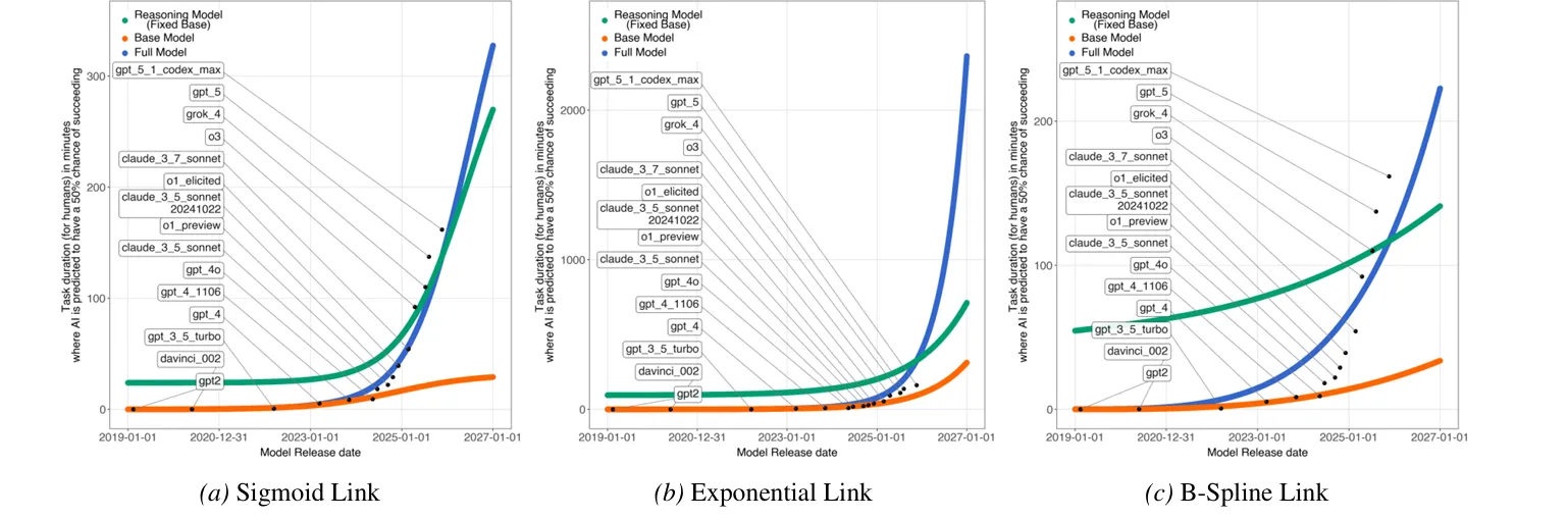 است. ضریب تعیین (R²) برابر با ۰.۹۸ گزارش شد که METR آن را به عنوان نشانهای قوی از رشد نمایی قابلیتها تفسیر کرد. آنها رگرسیون نمایی را با مدلهای خطی و هایپربولیک نیز مقایسه کردند و نتیجه گرفتند که منحنی نمایی بسیار بهتر است. با این حال، مقایسه محدود به چند مدل اولیه و بدون شواهد آماری قوی بود.