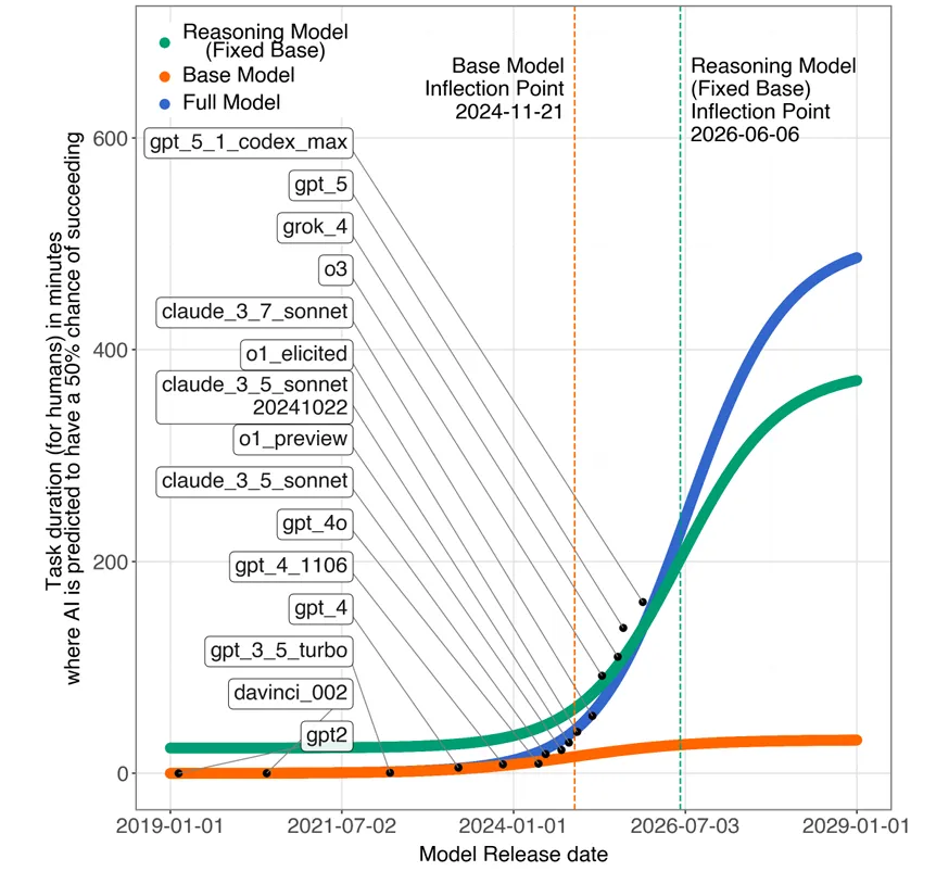 نکته مهم این است که بزرگی پیشرفتهای اخیر آشکار است، اما پرسش اصلی این است که آیا این پیشرفت ادامه پیدا میکند یا نه. در مطالعه METR ادعا شده که هیچ «نقطه عطف» واضحی وجود ندارد تا سرعت رشد کاهش یابد؛ اما ما نشان دادیم دادههای فعلی چنین چیزی را تأیید نمیکند. برای روشن شدن، نقطه عطف زمانی هر بخش را بر اساس پارامترهای برآورد شده مدل ضربی محاسبه کردیم. نتیجه این بود که نقطه عطف قابلیتهای پایه تقریباً در ۲۴ نوامبر ۲۰۲۴ رخ داده (نزدیک به زمان عرضه اولین مدل با قابلیت استدلال)، و نقطه عطف قابلیتهای استدلالی در حدود ژوئن ۲۰۲۶ پیشبینی میشود. به بیان دیگر، پس از انتشار o1-preview (۱۲ سپتامبر ۲۰۲۴)، قابلیت پایه تقریباً به نقطه اشباع رسید و پس از آن تنها قابلیت استدلال ادامه یافت. بنابراین تغییرات اخیر عمدتاً توسط بهبودهای استدلالی هدایت شده است. این تحلیل نشان میدهد که اگر دستاورد جدیدی در مقیاس توان استدلال رخ ندهد، رشد کلی نیز به اشباع خواهد رسید.