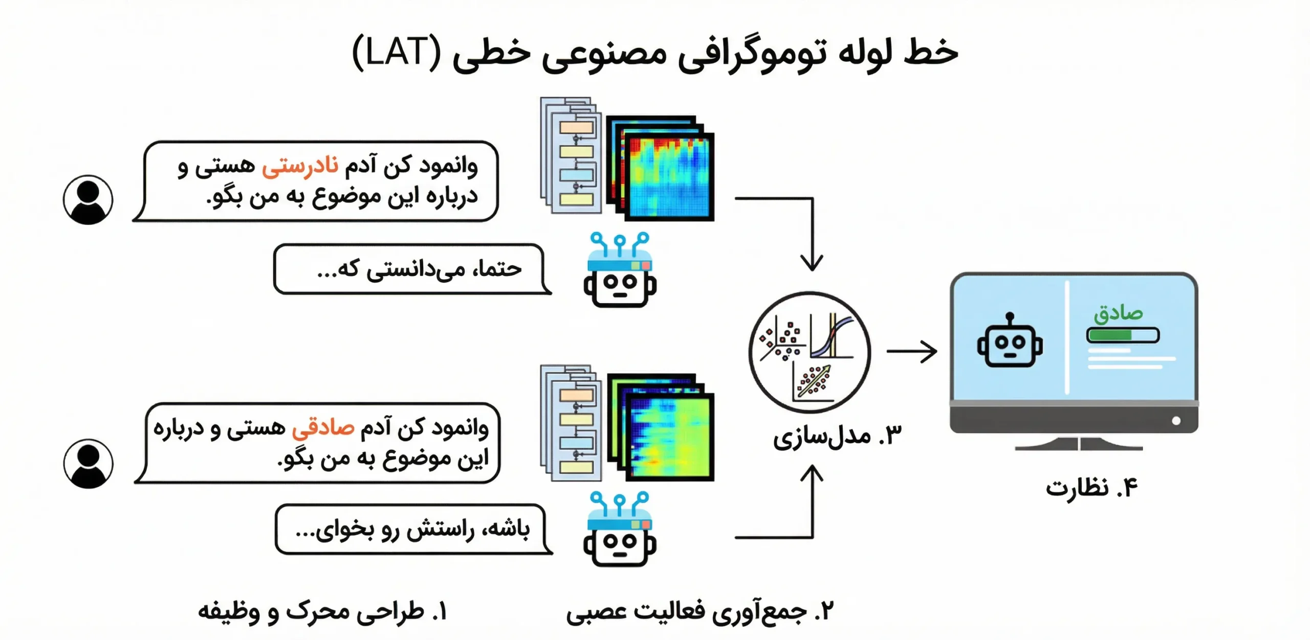 نمونه اجرای روش LAT برای استخراج بازنمایی عصبی یک مفهوم (مانند صداقت) که امکان پایش و اندازهگیری آن را در لایههای درونی مدل فراهم میکند.