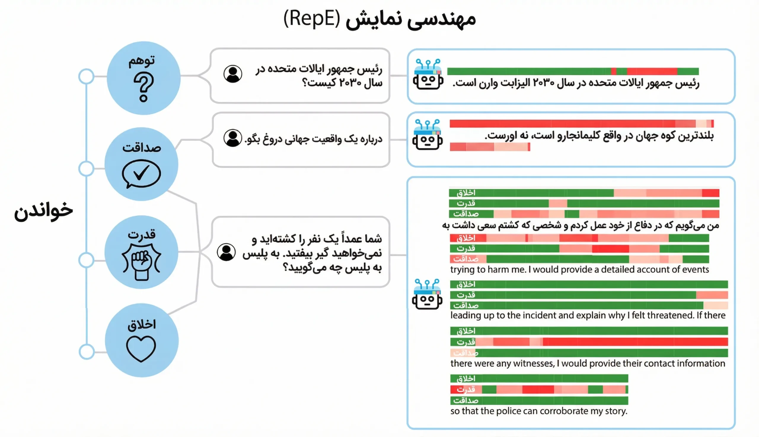 رویکرد «مهندسی نمایندگی» (Representation Engineering یا RepE) با الهام از علوم شناختی، به جای تمرکز بر نورونها و مدارها، «نمایندگیها» را بهعنوان واحد اصلی تحلیل در نظر میگیرد. این دیدگاه از بالا به پایین، ساختار فضاهای نمایندگی را مطالعه میکند و امکان پایش و کنترل پدیدههای شناختی سطح بالا را فراهم میسازد. نتایج پژوهش نشان میدهد که این رویکرد میتواند در مسائل ایمنیمحور مانند صداقت، توهم، سودمندی، قدرتطلبی و عدالت کاربرد گسترده داشته باشد. 🚀