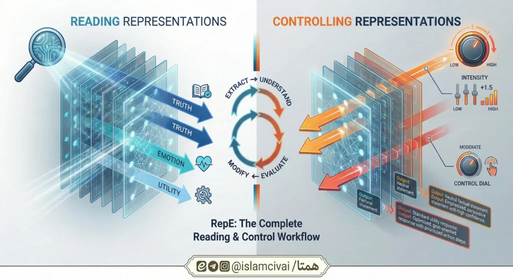 در بخش خواندن، هدف استخراج جهتهایی در فضای نمایندگی است که با مفاهیم خاص همبستهاند و بهصورت ساختارمند در لایهها ظاهر میشوند. در بخش کنترل، همین جهتها برای تغییر، هدایت یا تنظیم رفتار مدل استفاده میشوند. این چارچوب امکان ایجاد ارتباط علّی میان نمایندگی و رفتار را فراهم میکند و پلی میان تفسیرپذیری و مداخله عملی میسازد. 🔄