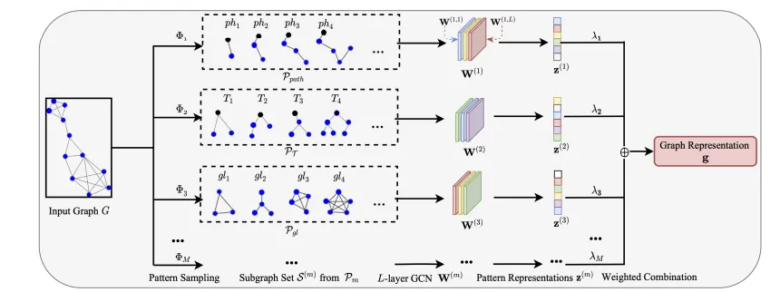 در این روش، ابتدا زیرگرافهایی مطابق با الگوهای گرافی مختلف از گراف اصلی نمونهبرداری میشوند. این زیرگرافها نماینده بخشهای معنادار ساختار گراف هستند و بهعنوان ورودی به شبکههای عصبی گراف داده میشوند. در گام بعد، نمایش هر الگو بهصورت مستقل و با استفاده از یک تابع یادگیری مبتنی بر GNN استخراج میشود. در نهایت، نمایش کلی گراف بهصورت یک ترکیب وزندار از نمایش الگوها ساخته میشود 🎛️؛ بهگونهای که وزنها نقش محوری در توضیحپذیری دارند و بهطور مستقیم نشان میدهند کدام الگوهای گرافی بیشترین سهم را در شکلگیری نمایش نهایی گراف ایفا میکنند.